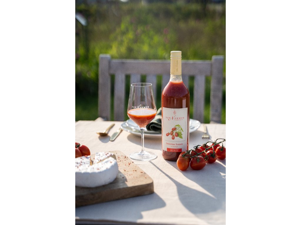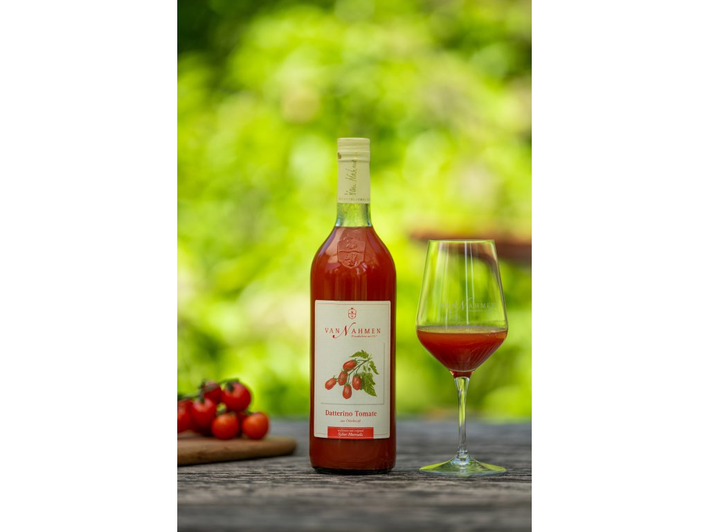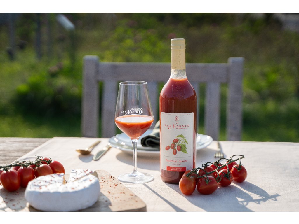 Van Nahmen Datterino tomatový džus je vyroben z rajčat Datterino pocházejících ze Sicílie. Tato malá, podlouhlá rajčata zářivě jasně červené barvy jsou známá jako „datlová rajčata“ díky svému tvaru připomínajícímu datli. Rajčata Datterino vynikají svým aromatickým profilem a výraznou sladkostí, která je vyšší než u běžných odrůd rajčat. Pro zdůraznění jedinečného charakteru této odrůdy spojil Peter van Nahmen své síly s vášnivým mlynářem koření Ingem Hollandem a přidal do džusu malé množství „syltské mořské soli“ ze sůlárny Alexandra Papeho. Pro dokonalý, zaoblený chuťový zážitek s mírně pikantním nádechem je k lahvi přiložen balíček černého pepře Kerala z koření Altes Gewürzamt Ingo Holland. Tento džus tak nabízí nejen sladkost a aroma, ale i jemnou kořeněnost, která podtrhuje jeho jedinečnou chuť.